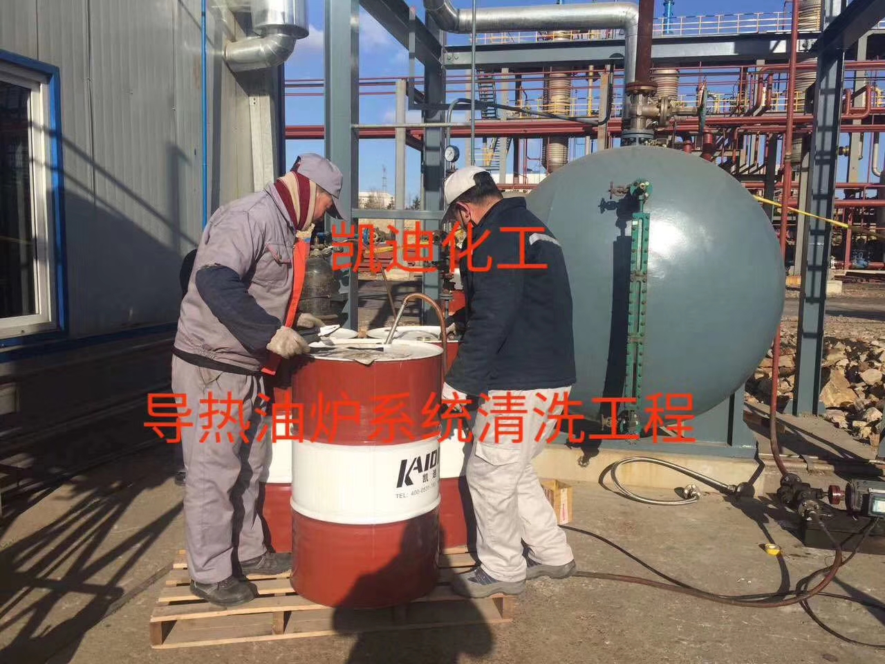 2019年1月28日,遼寧大連新材料公司導(dǎo)熱油爐系統(tǒng)整體清洗工程進(jìn)行中,使用藥劑為凱迪牌導(dǎo)熱油清洗劑產(chǎn)品!全力以赴,共同協(xié)作,做好工作。